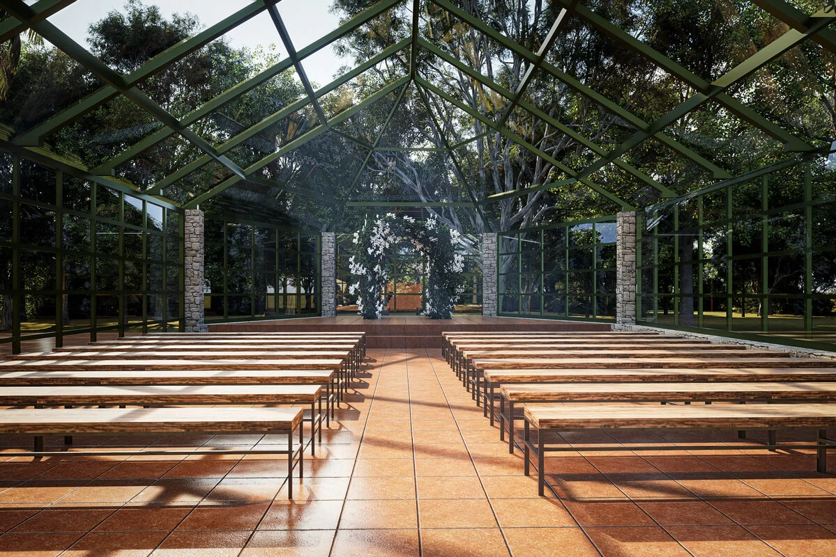 Arquitetura integrada à água e à natureza, perfeito para casamentos ao ar livre e celebrações ao pôr do sol.
